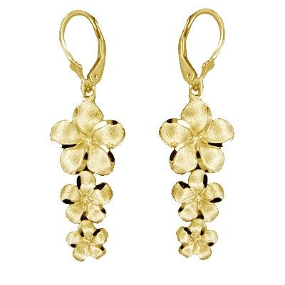 14kt White Gold Past Present and Future Plumeria Earrings with Lever Back. The flowers are 5/8", 3/8" and 1/4" in diameter with hand carved sand finish with diamond cut on the edge of each petal. Weighted over 4 grams.