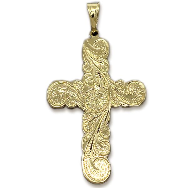14KT Yellow Gold X-Large Hand Scrolled Cross Pendant. 2 inches in height and 1.5 inches in width. Weight over 9 grams. The bale will fit up to 4mm chain.