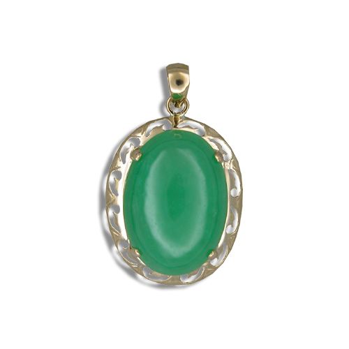 14KT Yellow Gold Oval Shaped Green Jade with Cut In Waves Design Pendant