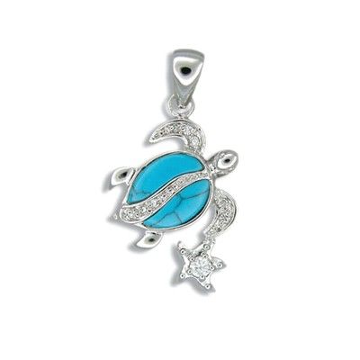 Sterling Silver Hawaiian Honu and Star Blue Turquoise Pendant with CZ. 1" by 5/8" with blue turquoise Inlay. The Honu is 5/8" diameter with 2 hand polished inlay Blue Turquoise stones. In addition, there is a CZ set in the center of the Star. This sterling silver pendant is finished with Rhodium to avoid tarnishing.