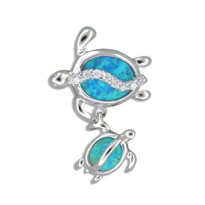 Sterling Silver Hawaiian Mother and Baby Honu Blue Opal Pendant. 5/8" in width and 1" in length with Blue Opal Inlay. This pendant is made with sterling silver and finished with Rhodium to avoid tarnishing.